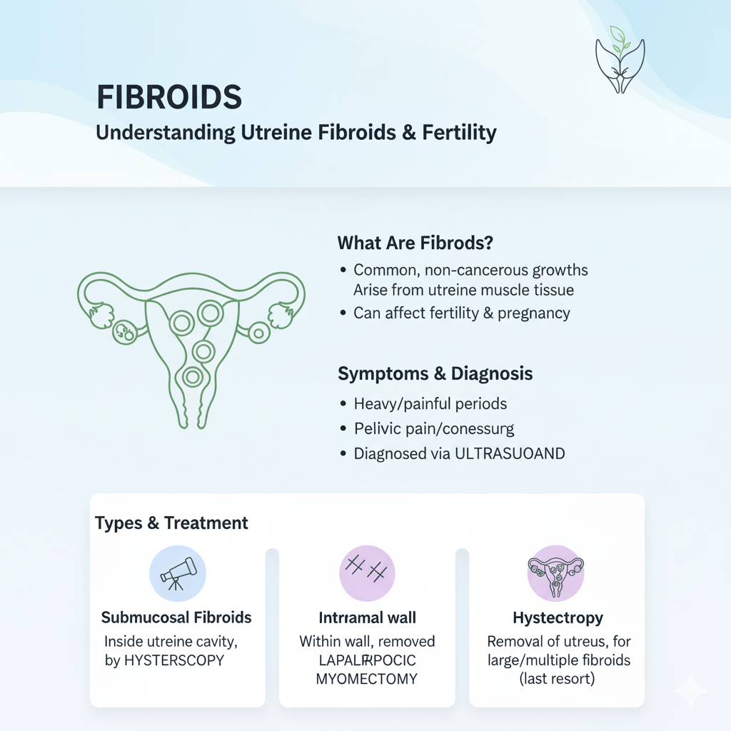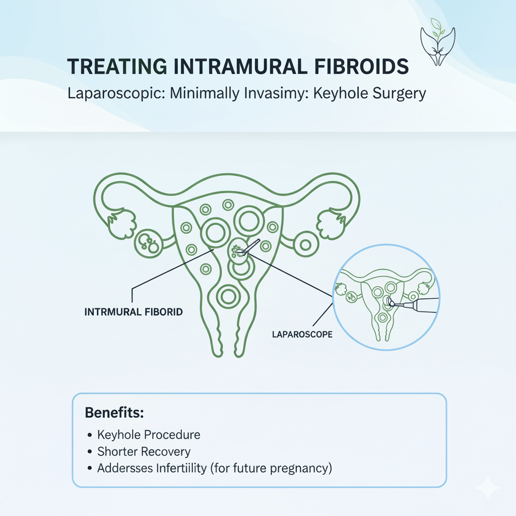 Intramural Fibroids: Located within the uterine wall, these may cause complications during pregnancy. If they are larger than 3-5 cm in an infertile woman, removal may be recommended. This is usually performed via laparoscopic myomectomy (keyhole surgery), which allows for a shorter recovery time.