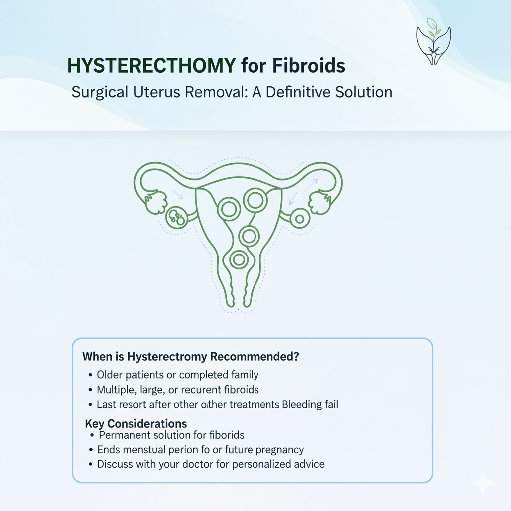 Hysterectomy: In older patients or those with multiple, large fibroids who have completed their family, a hysterectomy (removal of the uterus) may be the recommended option.