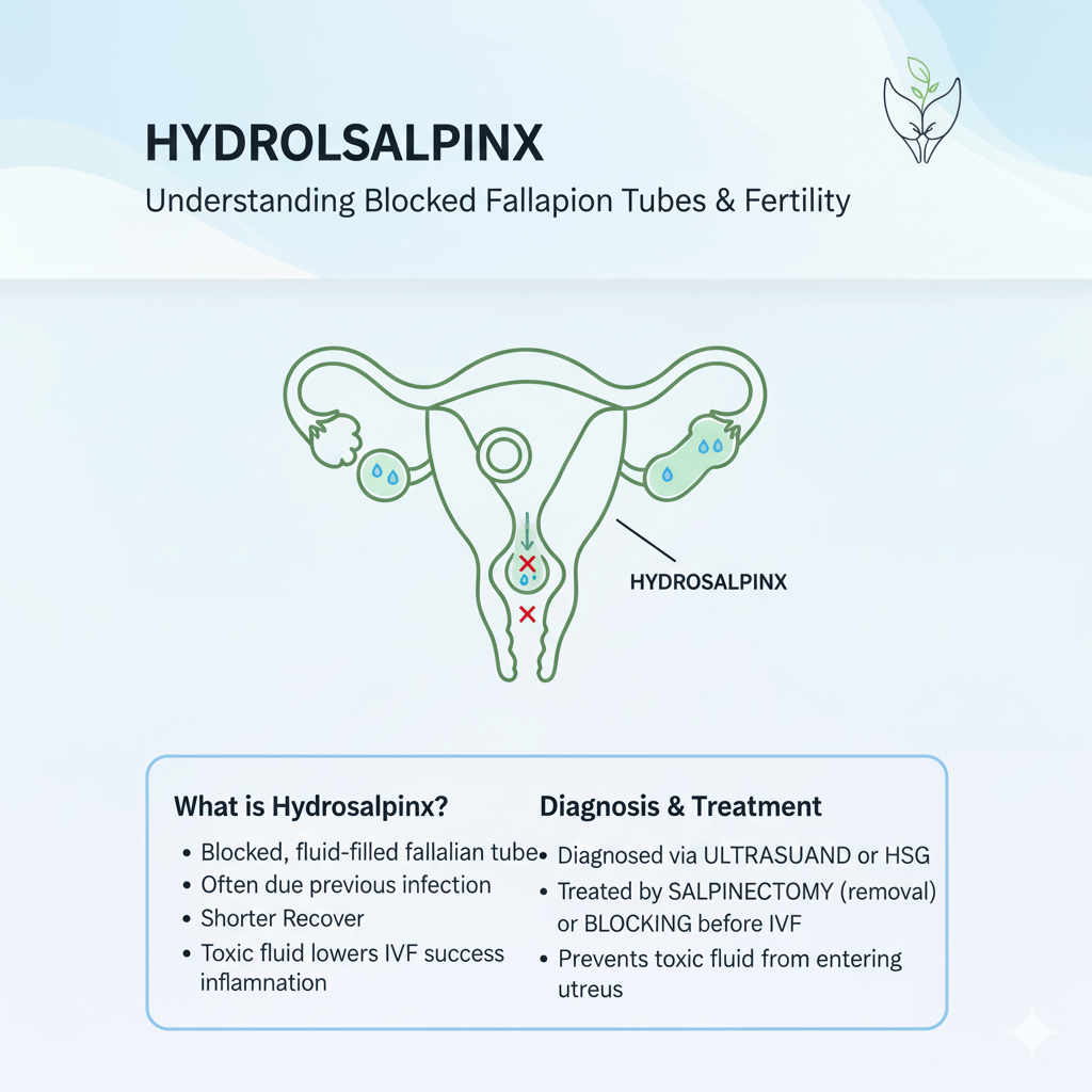 Diagnosis & Treatment Hydrosalpinx is diagnosed through a specialized ultrasound or a hysterosalpingogram (HSG), which uses a dye to visualize the fallopian tubes. To improve IVF success rates, it is crucial to either remove the affected fallopian tube (salpingectomy) or block it off from the uterus before starting treatment. This prevents the toxic fluid from compromising the uterine environment.