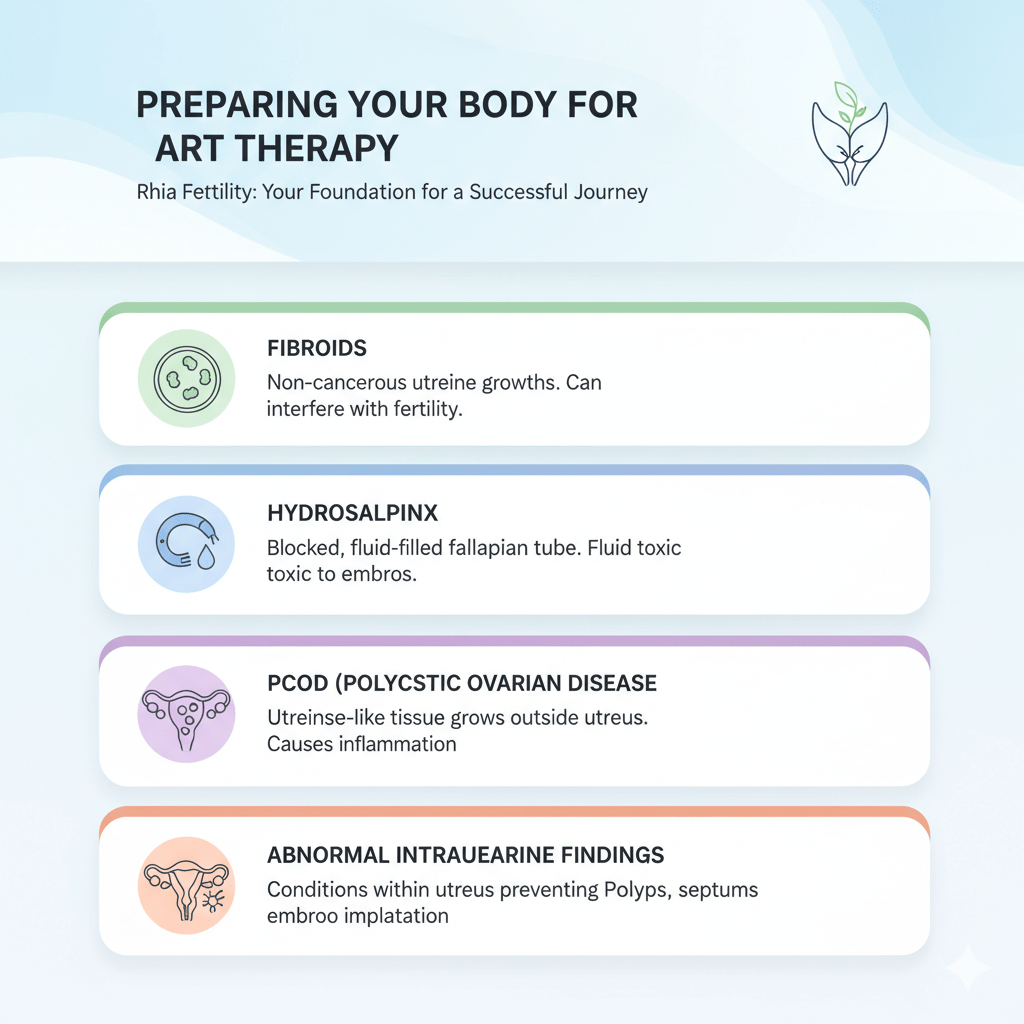 Preparing your body for Assisted Reproductive Technology (ART) is a crucial step in a successful fertility journey. At Rhia Fertility, we specialize in identifying and treating underlying conditions that could affect your treatment outcomes. This phase, known as Pre-ART Therapy, addresses issues such as fibroids, hydrosalpinx, PCOD, and endometriosis, ensuring the best possible foundation for your treatment.